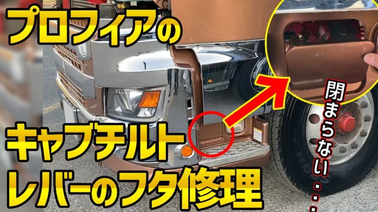 今回はプロフィアのキャブチルトレバーが格納されてる部分のふたが閉まらなくなっていたので、修理しました。