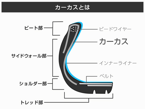カーカスとは、タイヤの骨格を形成する、ゴムで包まれたコード層の部分の事を言います。