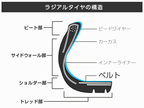 ラジアルタイヤの構造をかいつまんで言うと、トレッド面の性能重視の構造と言えますね。