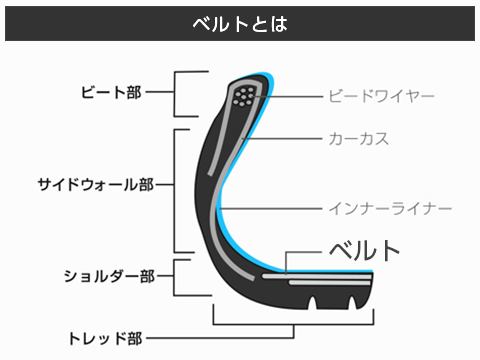 このラジアルタイヤの構造上、実はタイヤの強度が不足してしまうために、トレッド面に補強をするためのベルトが入っているんです。