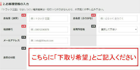 トラック王国で下取りをお申し込みの際は、買取申し込み時の「お客様情報の入力」欄「お車の状態」に、「下取り希望」とご記入ください!商談の際に、改めて下取りの意思について確認が行われます。
