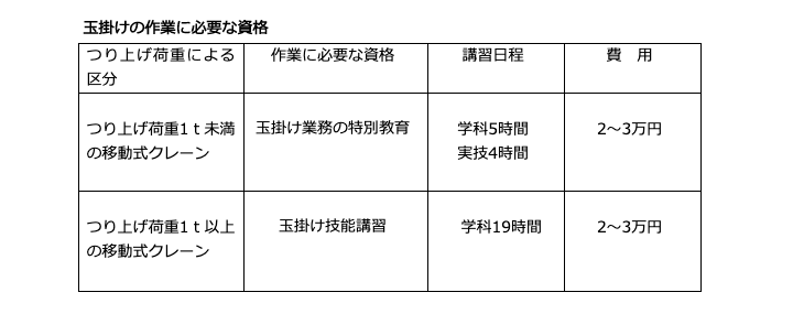 1t以上のクレーンの能力があった場合、玉掛けには技能講習を修了した方でなければ玉掛け作業に従事できません。これは労働安全衛生法によって定められています。玉掛けに従事する方は、技能講習修了証の携帯も免許書と同じように義務づけられています。