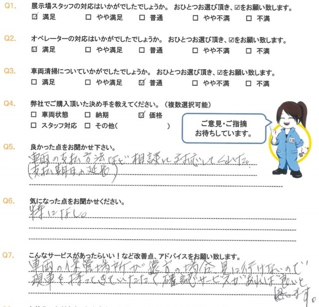 Q1.決め手使用勝手が合致したからQ2.良かった点縞板が張ってあり内フックが多かった事Q3.気になった点トルコンであった事。煽りの開閉補助が外されていた事Q4.要望など多少の改修要望が出来ると良い。例えば、煽り補助の取り付けとか。続きを読む