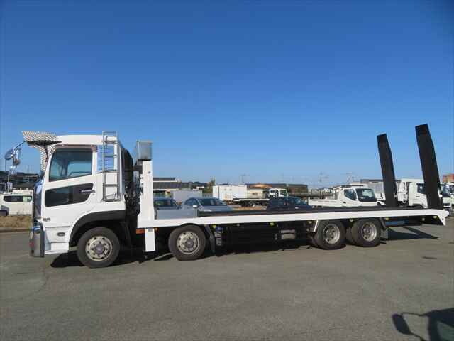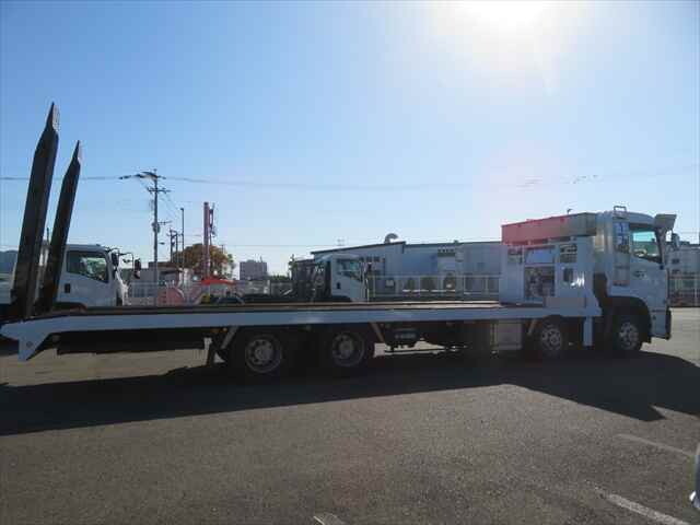 UDトラックスクオン 4軸重機運搬車 淡路ボデー製 型式:UHWA-1 ウインチ・ラジコン付 自動歩み ハイジャッキ 積載量12600kg 410馬力 6速シフト(ローモード・ハイモード有) タコグラフ ベッドあり 電動格納ミラー 坂道発進補助装置 全塗装済